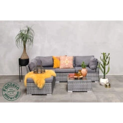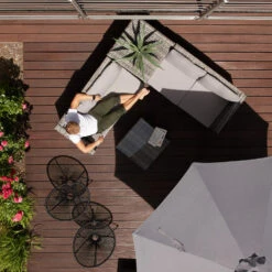Luxe zevendelig loungeset voor binnen en buiten. Dit veelzijdige set bestaat uit drie hoekbanken, drie middenstukken zonder armleuningen en een vierkante bijzettafel. De onderdelen zijn allemaal in elkaar te schuiven en met elkaar te verbinden middels een modulair verbindingssysteem, waardoor een grote, ruime hoekopstelling ontstaat. Je kan echter ook alle zitelementen als los plaatsen en zo de indeling flexibel naar wens aanpassen aan jouw ruimtelijke omstandigheden. De grote bijzettafel dient als praktische opbergruimte, als comfortabele voetenbank of zelfs als extra zitplaats. De stevige, zwarte voet is gemaakt van gepoedercoat aluminium. Dit loungemeubilair voor binnen en buiten is perfect om het hele jaar door buiten te gebruiken. Het tuinmeubilair is aan de binnenkant opgevuld met een sneldrogend schuim, dat dankzij zijn speciale structuur water veel sneller doorlaat dan zeer elastische schuimen.