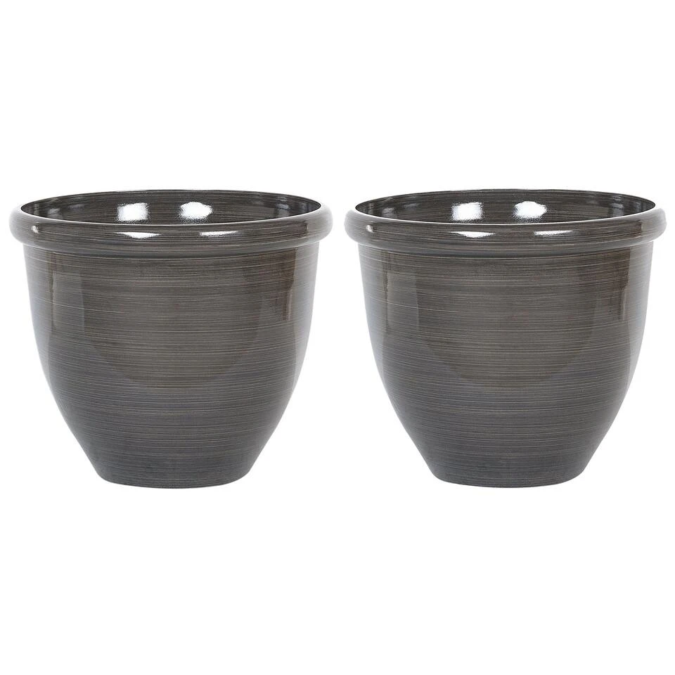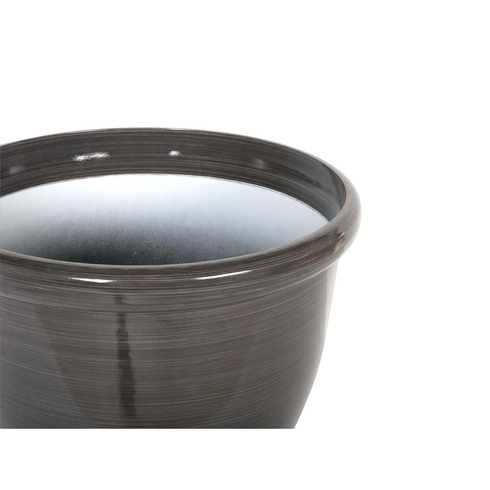 Ronde bloempotten in donkerbruin. Verbeter je binnen- of buitenruimte met deze stijlvolle, moderne bloempot. Met de ronde vorm en hoogglans finish, zal deze bloempot ongetwijfeld in verschillende woonruimtes, de tuin of op het balkon zijn plekje vinden. De pot is gemaakt van een steen en glasvezel-mengsel, is UV-bestendig en bestand tegen verschillende temperaturen. Als je deze pot buiten gaat gebruiken, vergeet dan niet een gaatje te boren op de gemarkeerde plaats in de bodem.