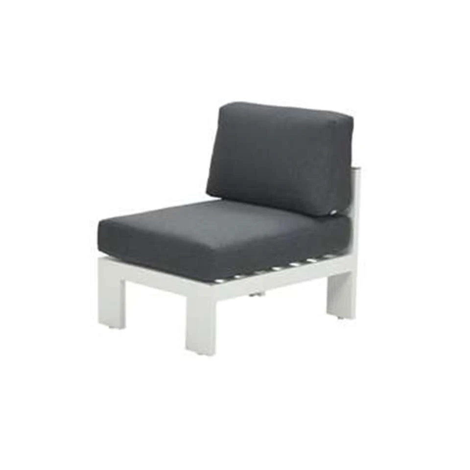 Wil je graag de Plaza loungeset uitbreiden? Bekijk dan eens het midden element van de Plaza serie. Het midden element is volledig gemaakt van aluminium met comfortabele lounge kussens. De rugleuning heeft een prachtige afwerking waardoor het lijkt alsof het van teakhout is gemaakt. Dit is gewoon aluminium met een teakhouten look. Het midden element is gemaakt van een onderhoudsvrij en weerbestendig aluminium frame met een stevige witte poedercoating. Deze laag zorgt ervoor dat het frame kras- en stootvast is. De rugleuning is voorzien van een teakhout look, maar is gewoon van aluminium. Dit geeft de loungeset een uniek uiterlijk. De meegeleverde kussens zijn gemaakt van hoogwaardig kwaliteit polyester. De kussens zijn voorzien van een rits waardoor de hoezen gemakkelijk met de hand kunnen worden gewassen. De kussens zijn niet waterbestendig en kunnen na gebruik worden opgeborgen in de schuur of kussenbox. Wel zijn de kussens voorzien van een waterafstotende coating. Dit is vooral erg praktisch als er bijvoorbeeld op het kussen wordt gemorst met drinken. Je veegt het vocht er namelijk gemakkelijk weer af. Het midden element wordt volledig gemonteerd geleverd, maar dient nog uitgepakt te worden. Het element wordt goed verpakt geleverd zodat er geen beschadigingen tijdens transport op komen. Het echte genieten kan daarna beginnen! De Plaza serie heeft een groot assortiment en is volledig uit te breiden naar wens. De gehele Plaza serie van kwaliteitsmerk Garden Impressions bestaat uit; een 3-zits bank, hoek bank, midden element, poef, lounge tafel, lounge fauteuil en een lounge dining tafel. De Plaza serie is leverbaar met een witte of donker grijze coating. De afmeting van het middenelement is 67,5 x 85 x 65 cm.