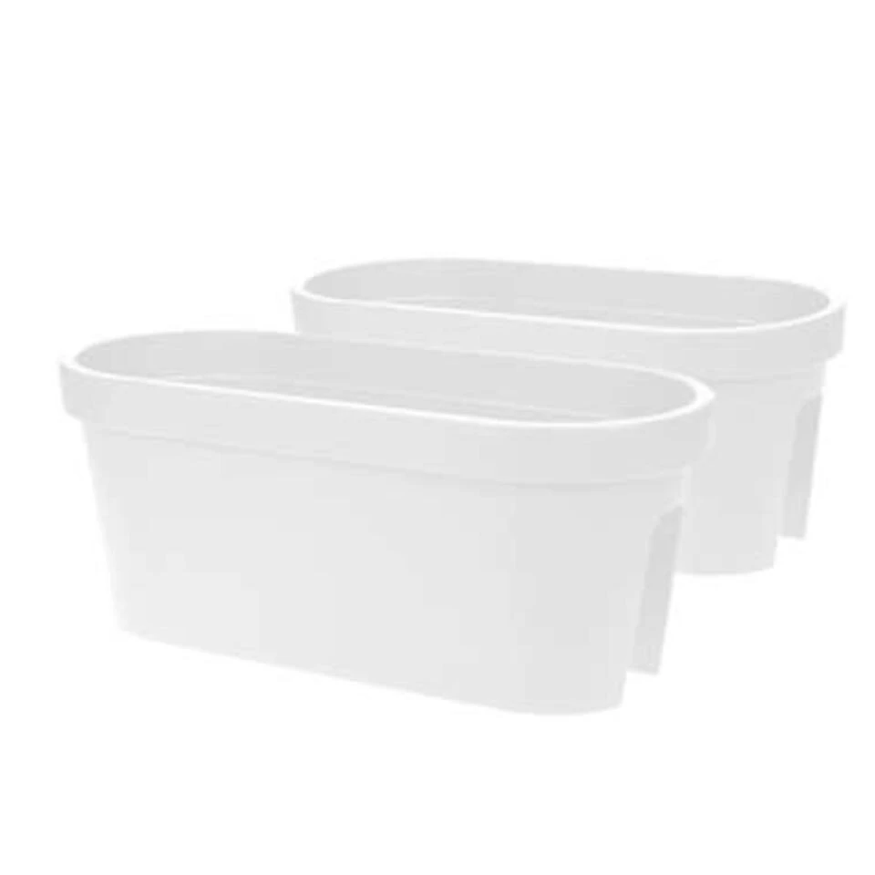 Balkon plantenbak/bloembak wit ovaal. Formaat: lengte ca 60 cm. Breedte ca 28 cm. Hoogte ca 25 cm. Materiaal: kunststof, kras en stootvast. Geschikt voor binnen en buiten gebruik.