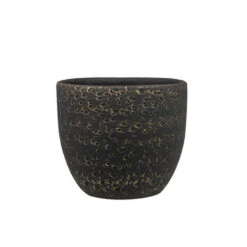 Plantenpot/Bloempot in het lava-look zwart Dia 15 cm en Hoogte 13 cm. Deze bloempotten zijn geschikt voor binnen. Serienaam Rinca. Materiaal: keramiek. Niet vorstbestendig.