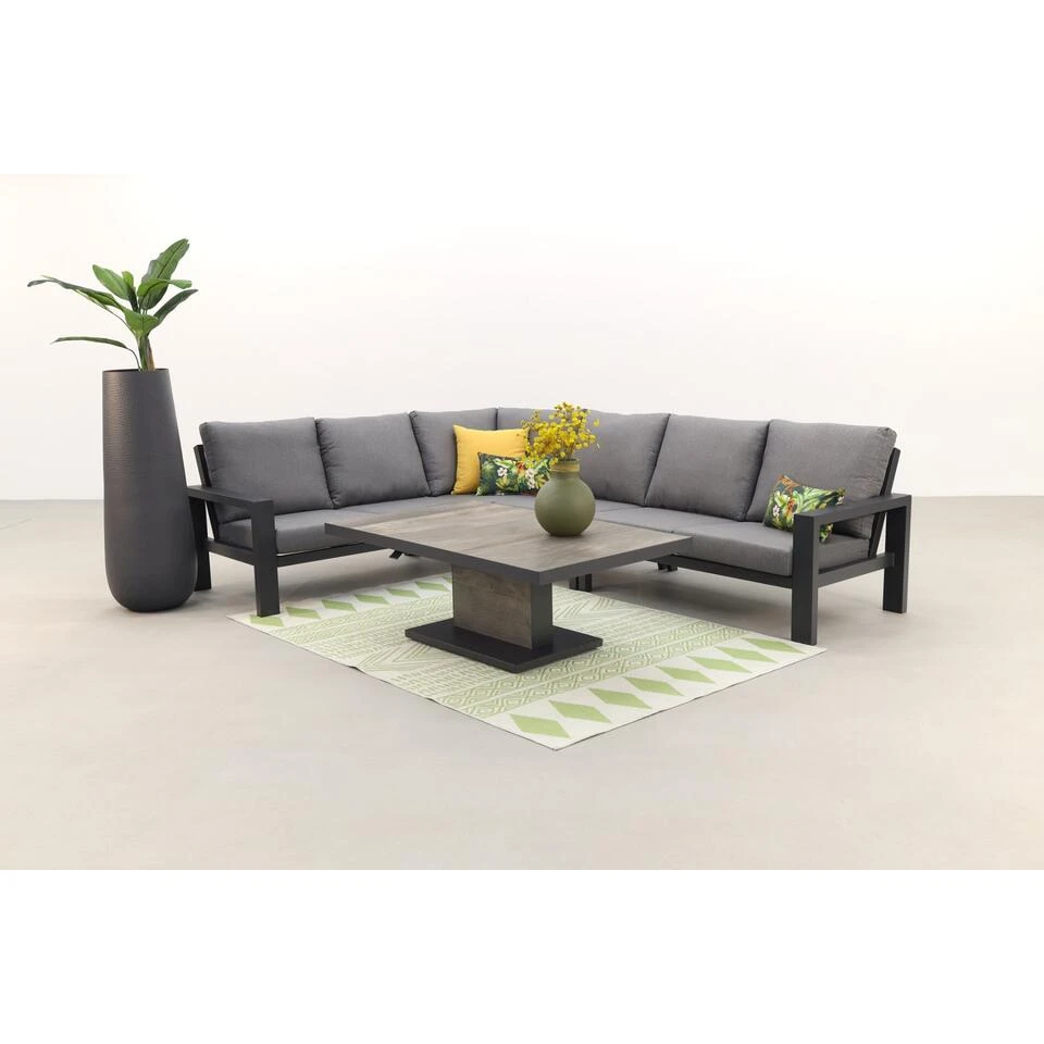 Op zoek naar een moderne en comfortabele loungeset? Dan is de Montana/Jersey loungeset zeker een aanrader. Dankzij de in hoogte verstelbare tafel is het ook mogelijk om te dineren. Hierdoor kun je optimaal genieten van het buitenleven. De Montana/Jersey loungeset antraciet heeft een comfortabele zit en wordt geleverd met dikke loungekussens. De loungeset bestaat uit 1 linkse bank, 1 rechtse bank, 1 hoekelement, 1 middenelement en 1 lounge/diningtafel. Voor een nog sfeervollere uitstraling kun je er ook voor kiezen om de loungeset te combineren met een buitenkleed.